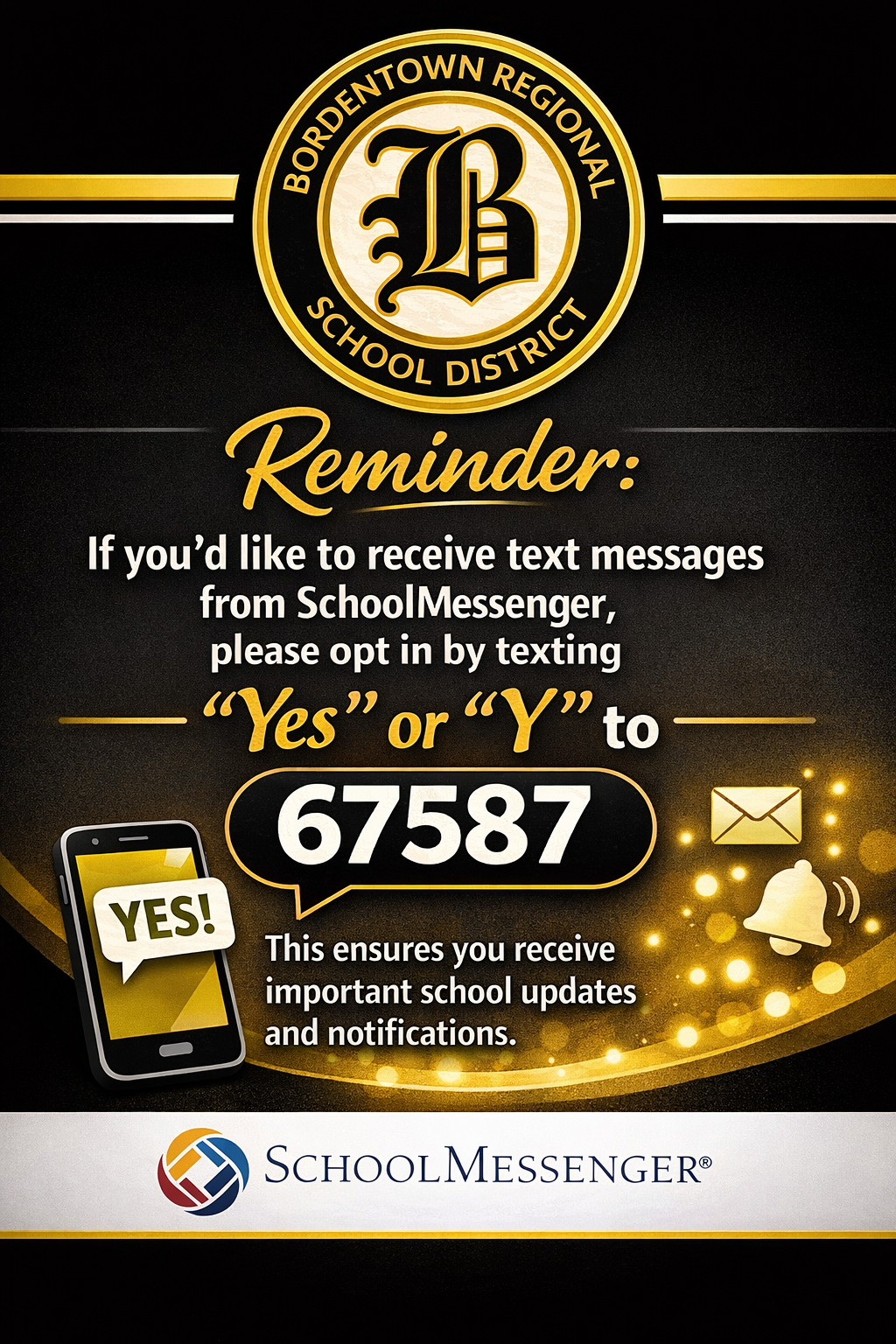 Reminder: If you’d like to receive text messages from SchoolMessenger, please opt in by texting “Yes” or “Y” to 67587. This ensures you receive important school updates and notifications.