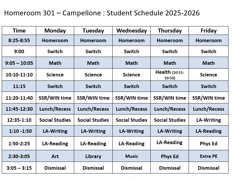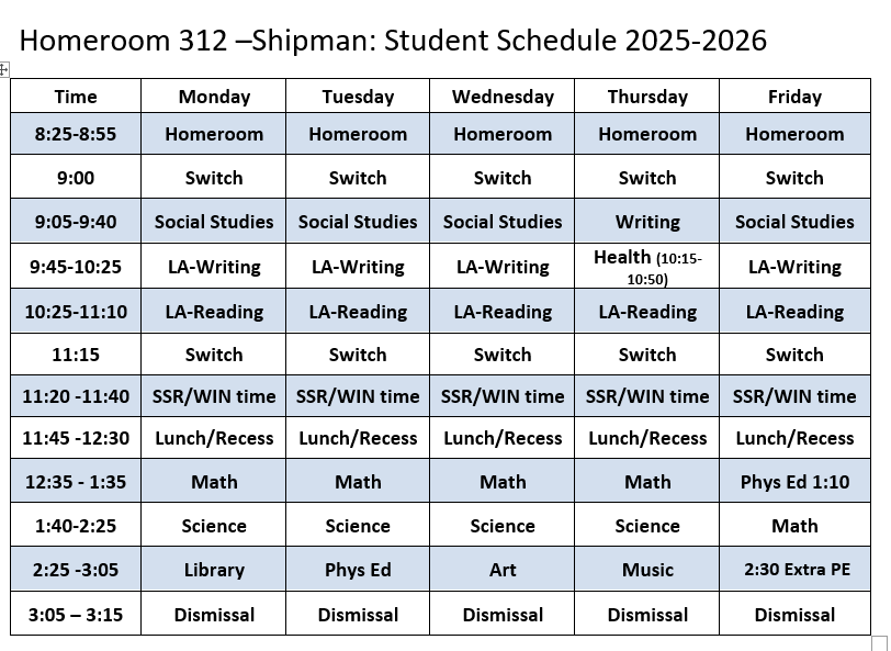 Schedule for this year (both homerooms) - click on the image to pause for your homeroom!